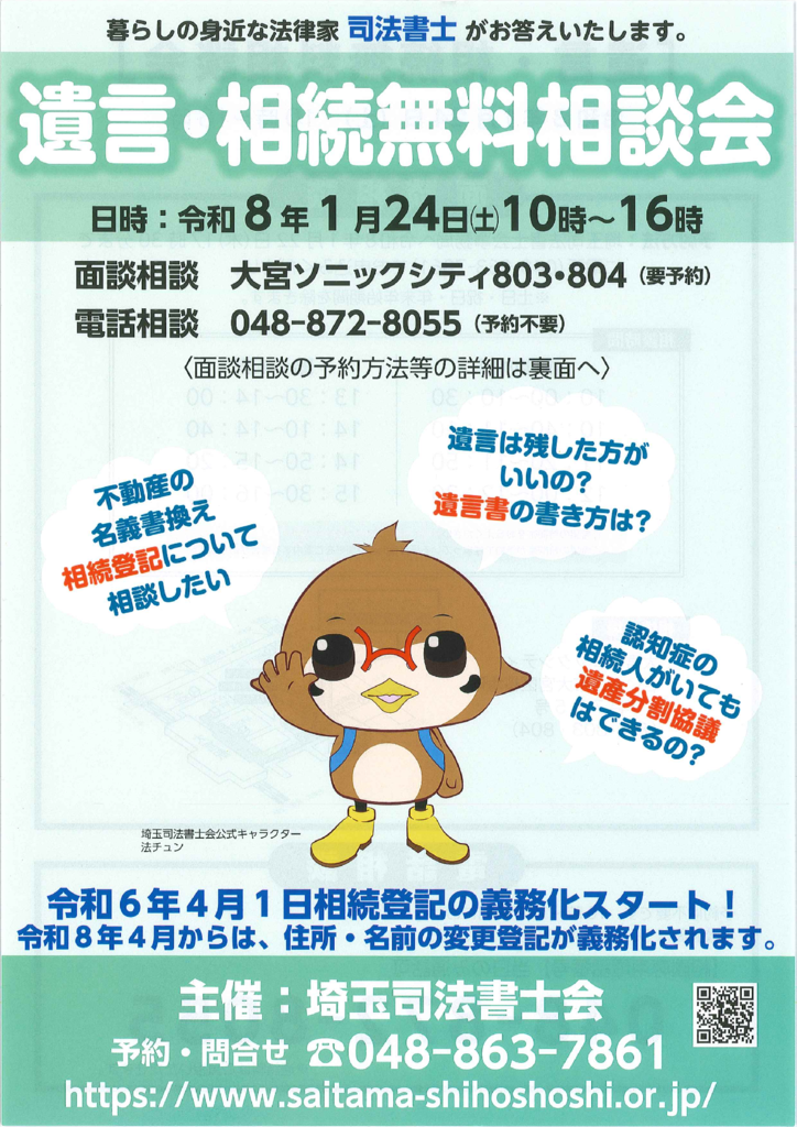 | 日時・会場 | 令和8年1月24日(土)10時~16時 【面談相談(要予約)】 大宮ソニックシティ 8階803・804 〈予約方法〉 埼玉司法書士会事務局へ令和8年1月22日(木)17時30分までに電話(048-863-7861)でお申込みください。 ※土日・祝日・年末年始期間を除きます。 【電話相談(予約不要)】048-872-8055(当日のみ通話可) |