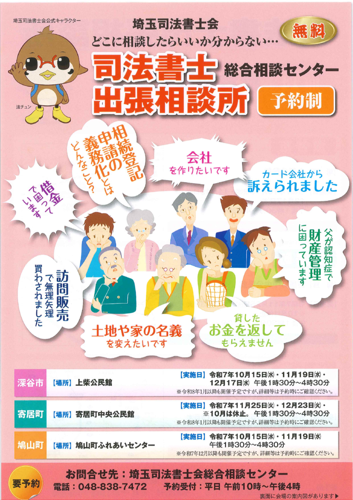 ■「司法書士総合相談センター出張相談所」開催のお知らせ(令和7年10月~12月)