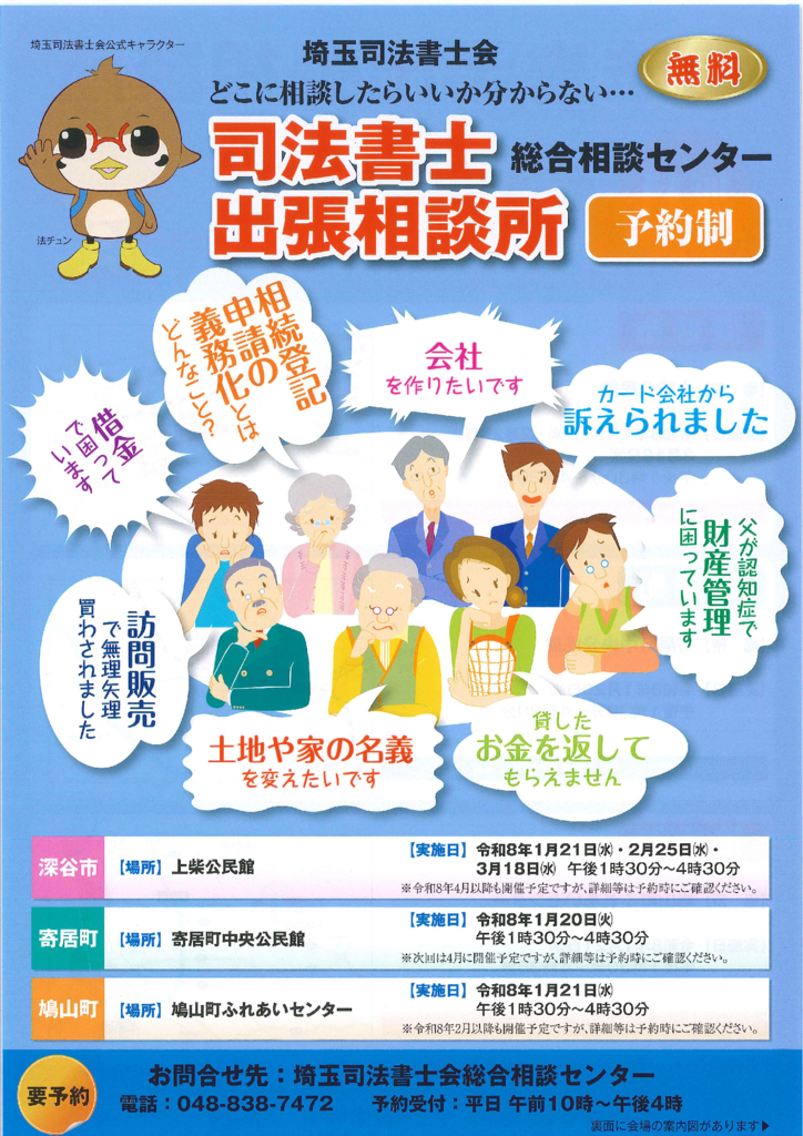 ■「司法書士総合相談センター出張相談所」開催のお知らせ(令和8年1月~3月)