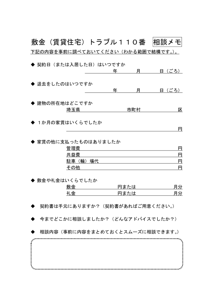 | 相談電話番号 | 048-872-8055 この電話番号は特設電話のため、相談日以外は通じません。 ※御相談に際しては契約書等を用意していただき、事前に要点をよく整理の上、御相談ください。 ※下記の「相談メモ」を併せて御活用ください。 |