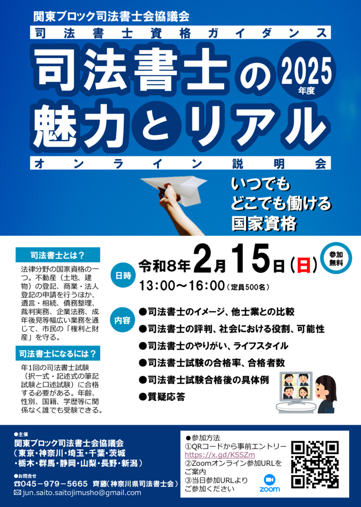 ■【関東ブロック司法書士会協議会主催】「司法書士資格ガイダンス 2025年度オンライン説明会」の開催について(令和8年2月15日開催)