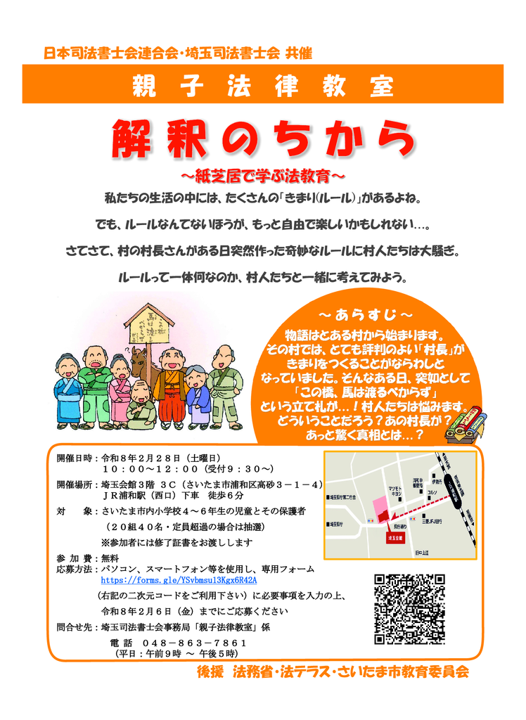 埼玉司法書士会は、日本司法書士会連合会と共催で、親子法律教室を開催いたします。私たちの生活の中にある様々なきまり(ルール)は、一体何のためにあるのか?小学生にもわかりやすいように紙芝居を使って説明し、楽しみながら法律について学んでもらうイベントです。多くの皆さまの御参加をお待ちしております。| 日時 | 令和8年2月28日(土) 10:00~12:00(受付9:30~) |